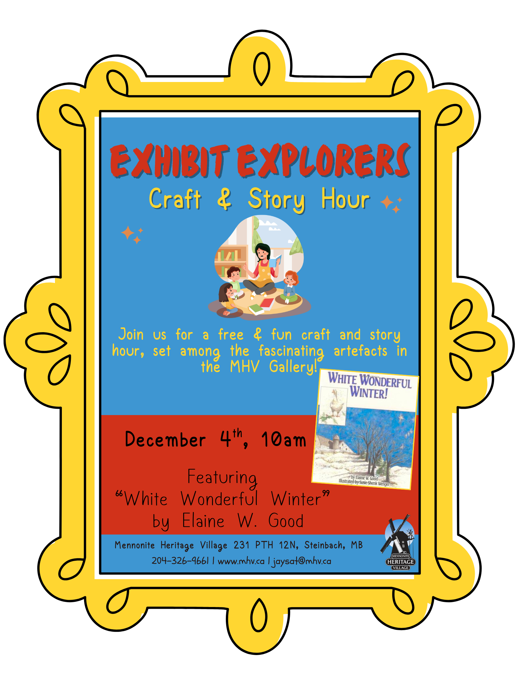 Join us at the Mennonite Heritage Village on December 4th for an engaging morning set among the fascinating artefacts in MHV’s Gallery! During Exhibit Explorers: Craft & Story Hour, children will enjoy lively stories and creative crafts that spark imagination and curiosity.