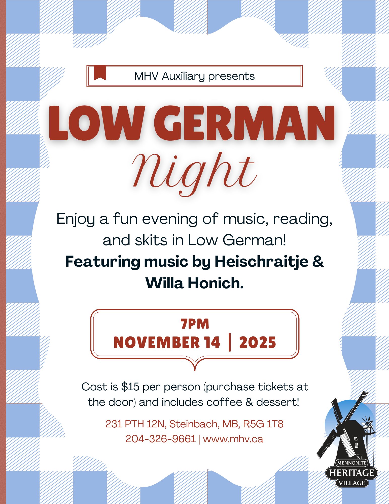 Enjoy a fun evening of music, reading, and skits in Low German! Featuring special music by Heischraitje & Willa Honich. Tickets are $15 (purchased at the door on the day of) and include coffee and dessert.