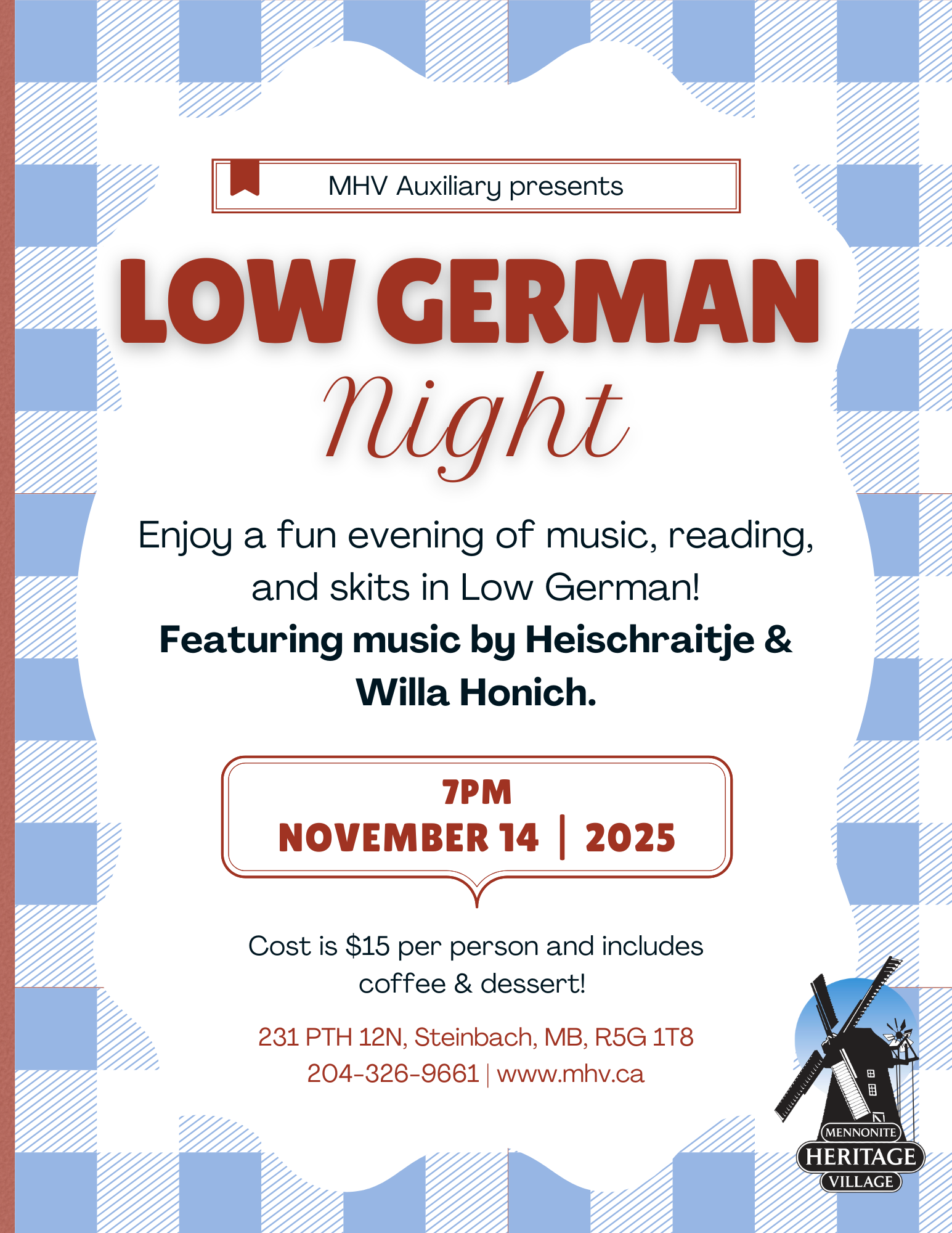 Enjoy a fun evening of music, reading, and skits in Low German! Featuring special music by Heischraitje & Willa Honich. Tickets are $15 (purchased at the door) and include coffee and dessert.
