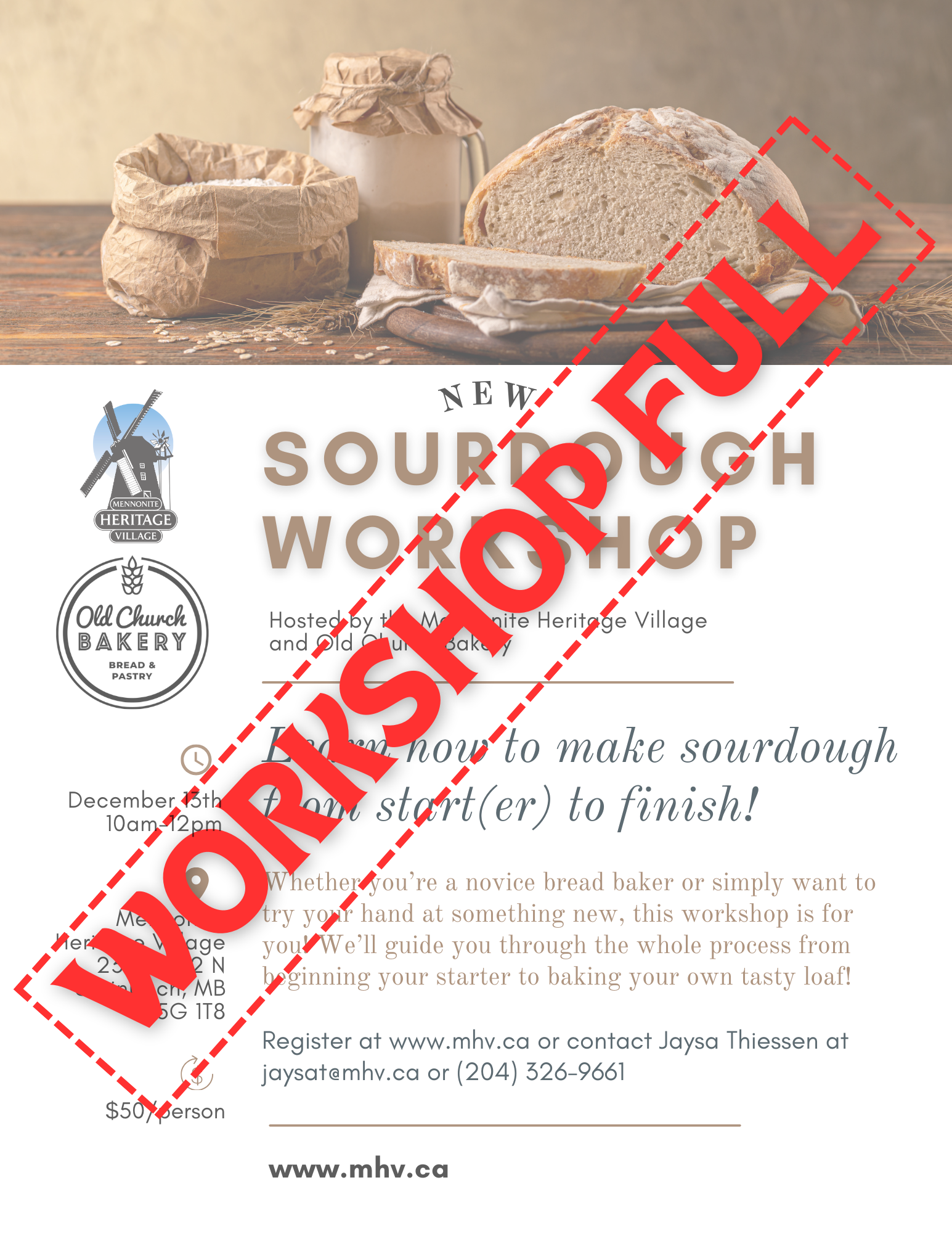 Mennonite Heritage Village 231 PTH 12 N, Steinbach, ManitobaMHV and Old Church Bakery's Sourdough Workshop is FULL! Thank you so much to everyone who registered! We won’t be taking more applications, but feel free to email Jaysa Theissen at jaysat@mhv.ca to be put on a waiting list in case some of our participants aren’t able to make it. We are planning to