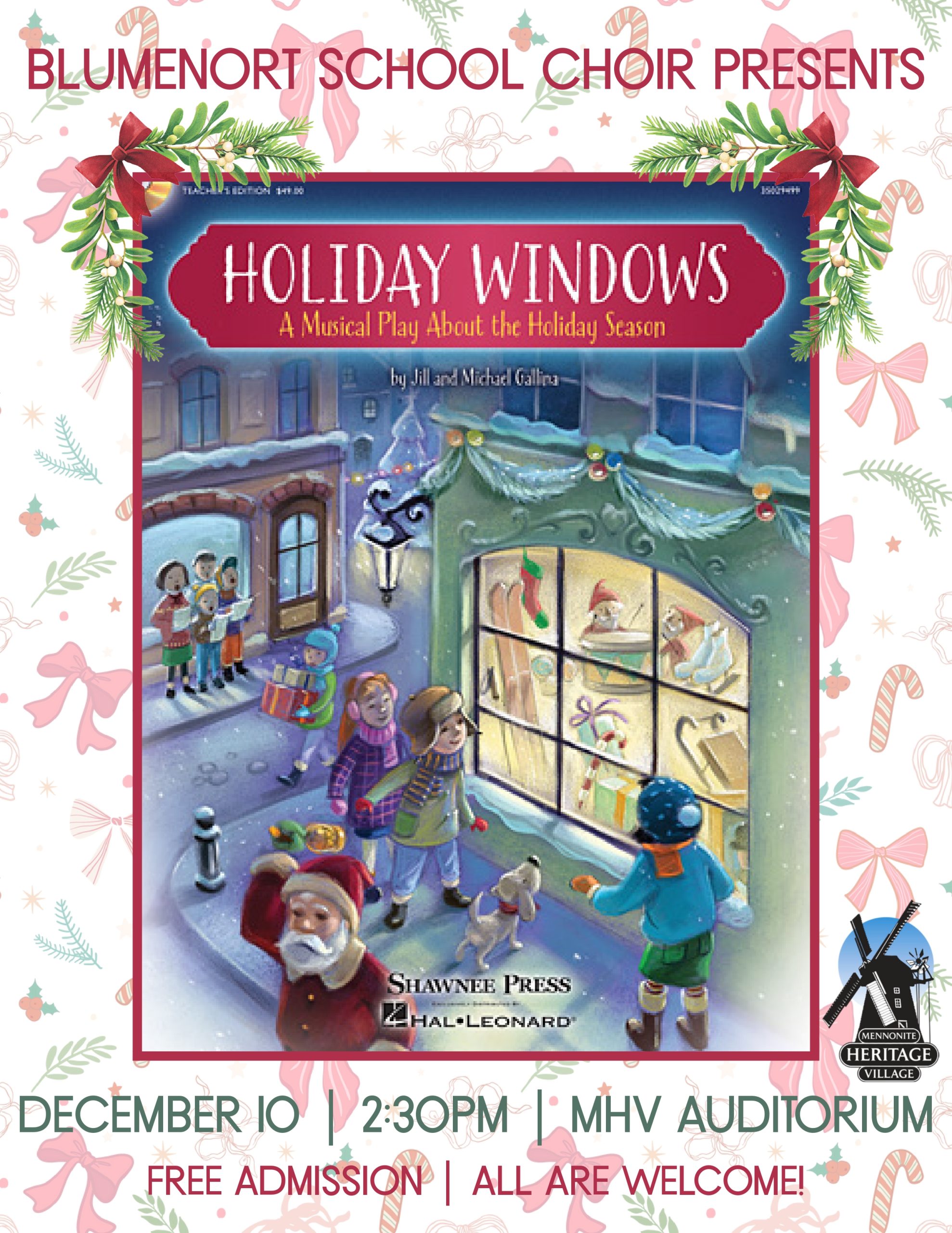 Mennonite Heritage Village 231 PTH 12 N, Steinbach, ManitobaBlumenort School Choir performs “Holiday Windows”! Celebrate the Christmas season with a free Christmas concert put on by the Blumenort School choir! Enjoy their performance of “Holiday Windows” – a