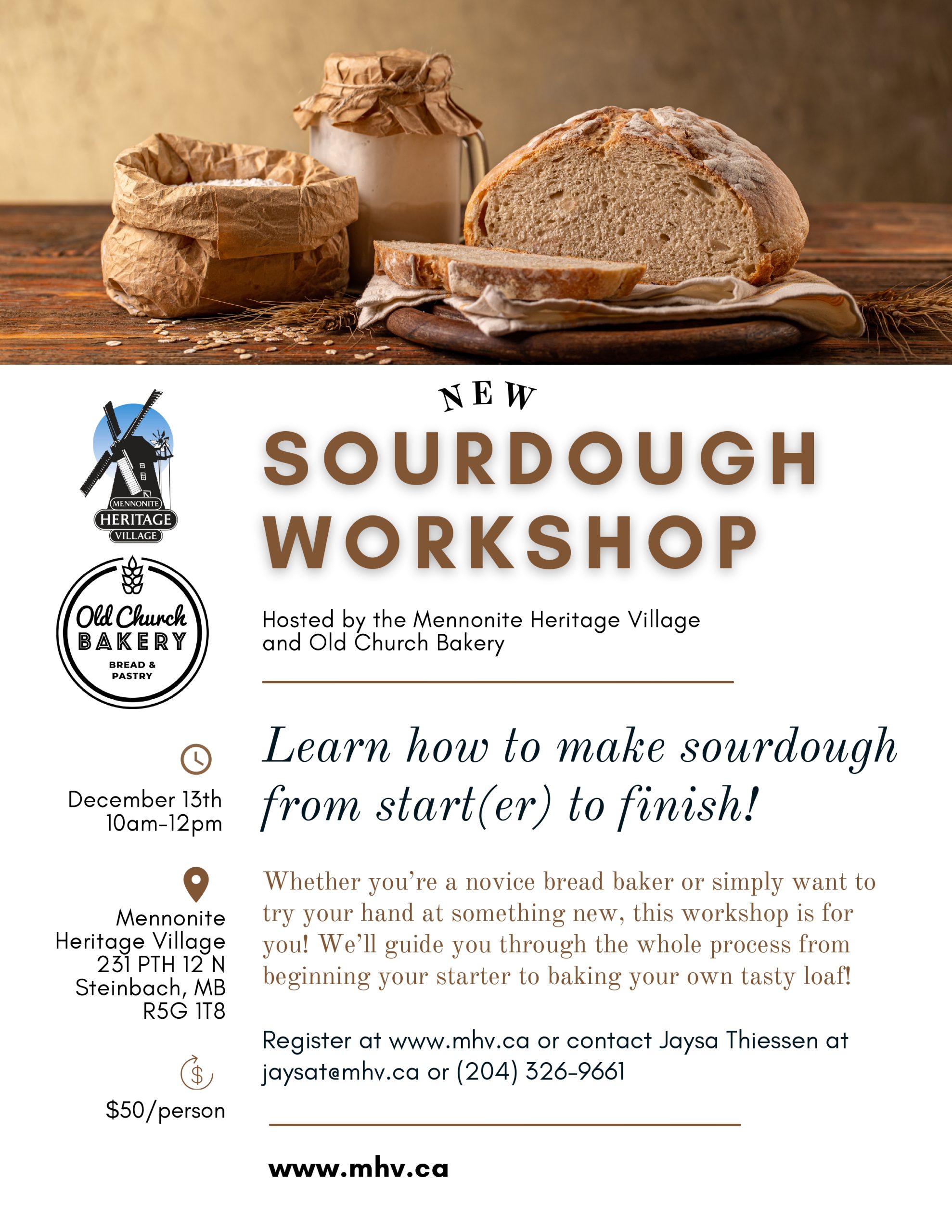 Mennonite Heritage Village 231 PTH 12 N, Steinbach, ManitobaJoin MHV for a Sourdough Workshop led by the staff at Old Church Bakery! Whether you’re a novice bread baker or simply want to try your hand at something new,