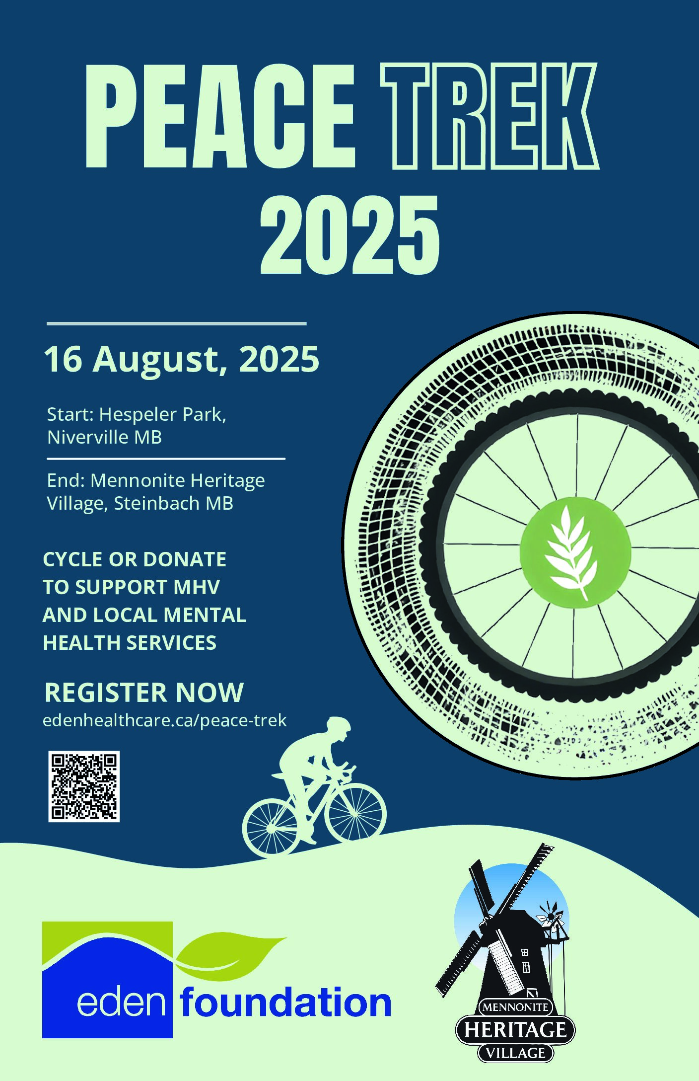 The Mennonite Heritage Village and the Eden Foundation are excited to announce our 2025 Peace Trek! On August 16th, 2025, we’ll ride the historic Peace Trail to celebrate the peace and heritage we cherish here in Canada. We’re aiming to raise $30,000, and you can help us achieve this goal by participating in the Peace