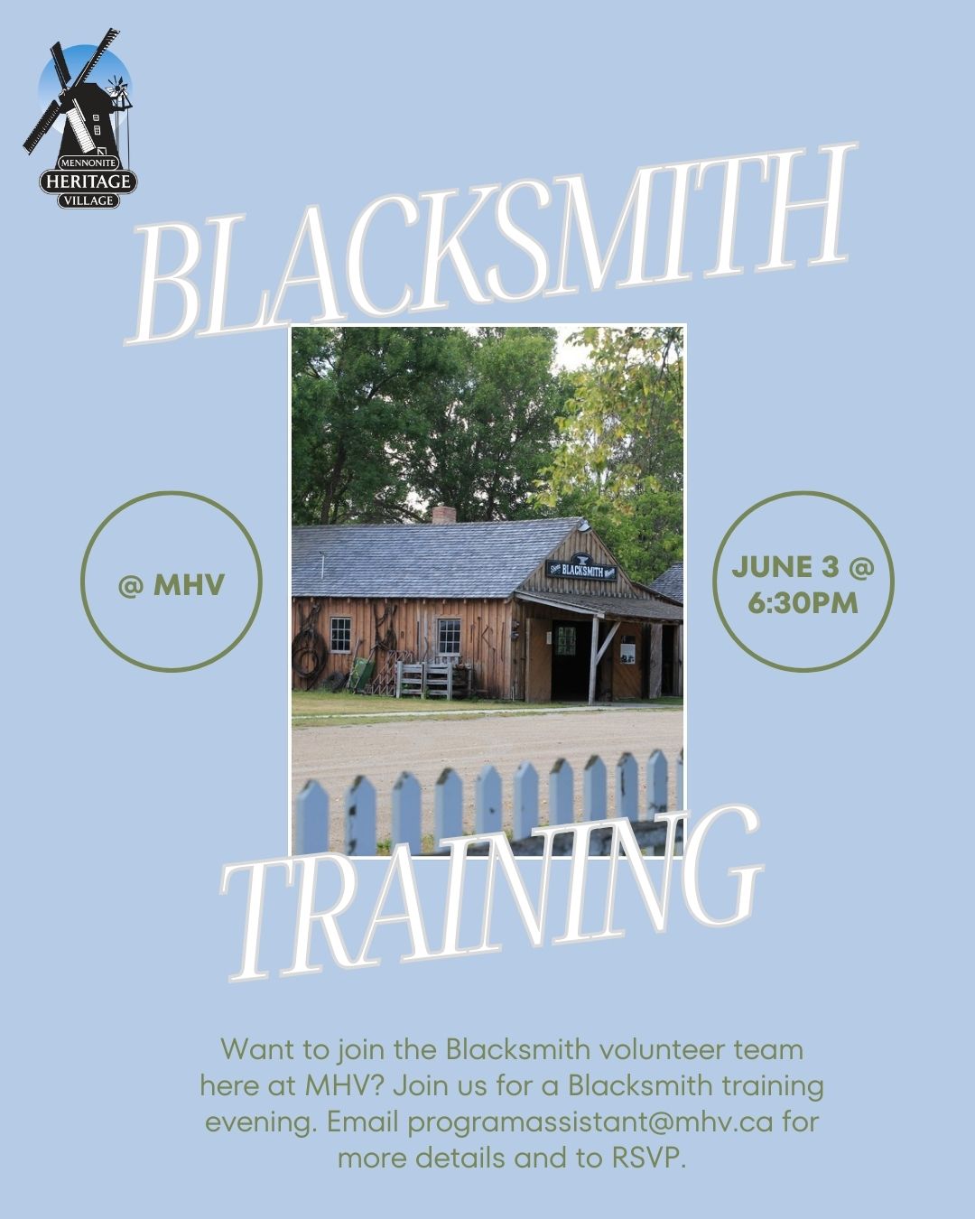 To all MHV current and potential members, Mennonite Heritage Village (Canada) Inc. invites you to the 60th Annual General Meeting to be held at the MHV on Tuesday, April 8th at 7:00pm.Agenda:1. Reports from the Management and Board of Directors2. Auditor’s Report3. Election of Directors4. Appointment of auditors for 2025 Refreshments will be served. Everyone