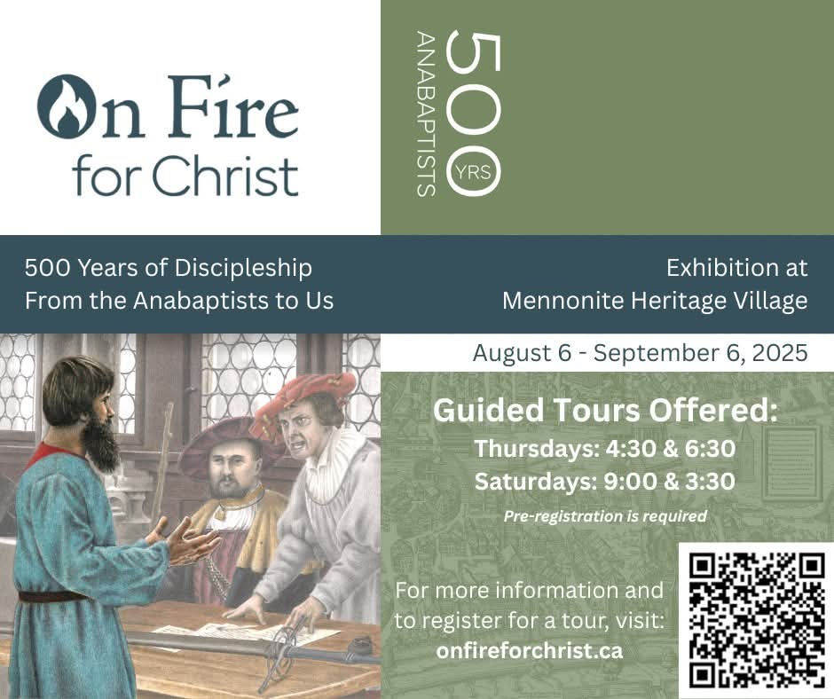 On Fire For Christ Exhibit, August 6 - September 6 As we celebrate the 500th anniversary of Anabaptism in 2025, Mennonite Heritage Village (MHV) is pleased to be hosting On Fire for Christ: 500 Years of Discipleship, From the Anabaptists to Us, a travelling exhibit commemorating this milestone event. Visit www.onfireforchrist.ca for more information!