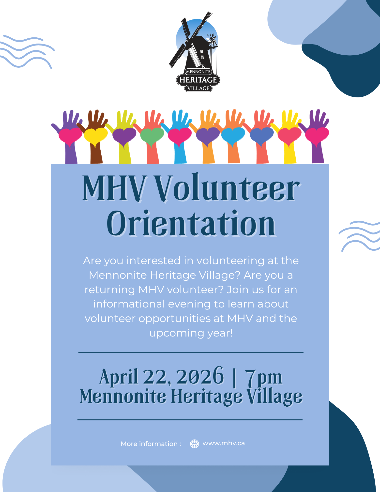 Mennonite Heritage Village 231 PTH 12 N, Steinbach, ManitobaWant to join the MHV Volunteer Team? We would like to invite you to our Volunteer Orientation! This informational evening will discuss the various volunteer opportunities that MHV offers. Our