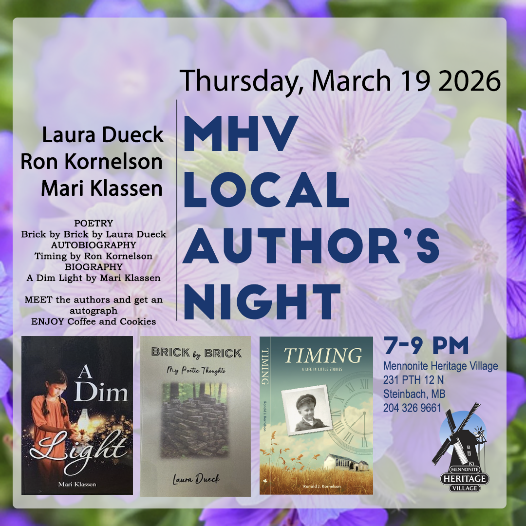 Join us for the MHV Local Author's Night, featuring: Brick by Brick by Laura Dueck, poetry Timing by Ron Kornelson, memoir A Dim Light by Mari Klassen, biography Meet the authors,