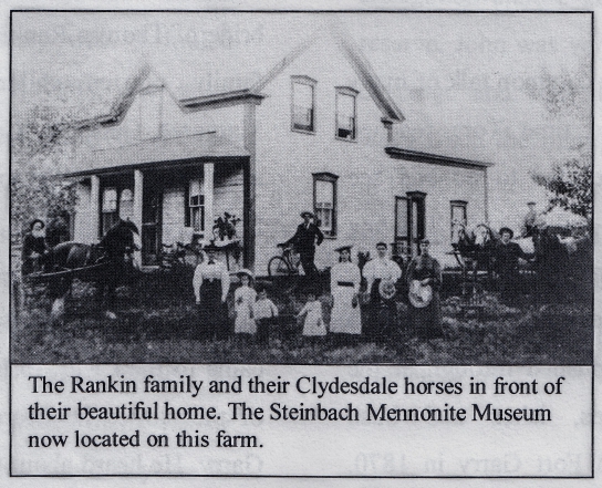 With the coming of the Mennonites in 1874, the Rankins could soon do their shopping in Steinbach, where Klaas R. Reimer set up a store in 1877. This is the little white building at the Mennonite Heritage Village, now sitting within calling distance of the Rankin’s place. Rankin soon realized that his farming and entrepreneurial talents matched those of the most progressive of the Mennonites and within a few years he was in the lumber and shingle-making business with Reimer himself. He also partnered with super-entrepreneur A. S. Friesen to introduce a reaping machine, which served the entire community. Other Clear Springs farmers introduced the Mennonites to threshing machines and steam engines.